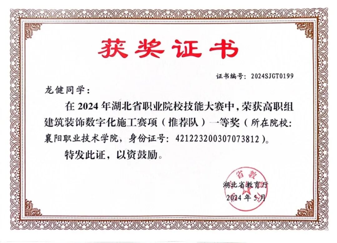 龙健、柯萍轲、杨诗语 | 2023年 | 湖北省职业院校技能大赛“建筑装饰数字化施工”赛项(推荐队) | 一等奖 | |