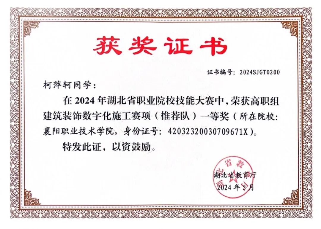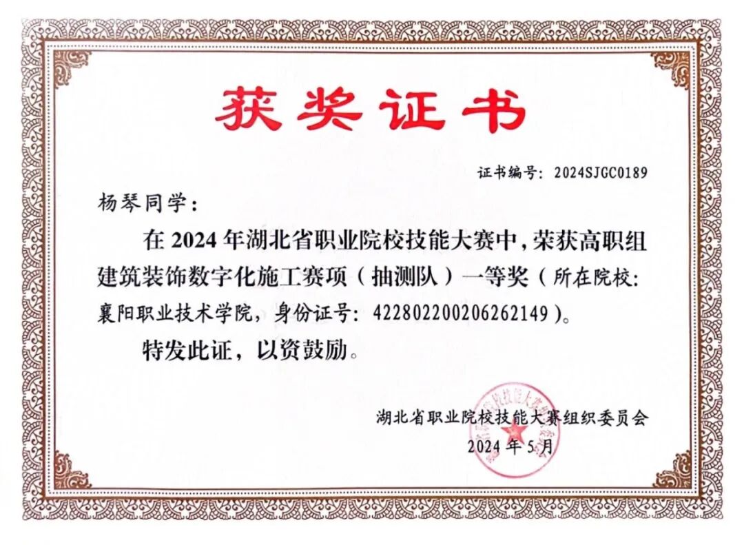 杨琴、姚英凡、刘俊格 | 2023年 | 湖北省职业院校技能大赛“建筑装饰数字化施工”赛项(抽测队) | 一等奖 | |