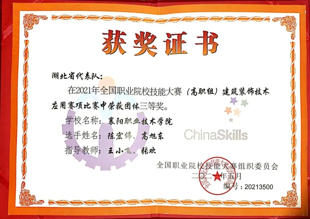 学生 | 樊森淼、陈宏伟、高旭东 | 2021年 | 湖北省职业院校技能大赛“建筑装饰技术应用”赛项(推荐队) | 一等奖 |