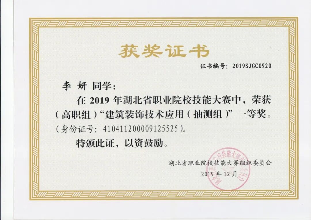 李妍、姜笑言、卢澳晨 | 2021年 | 湖北省职业院校技能大赛“建筑装饰技术应用”赛项(抽测队) | 一等奖 | |