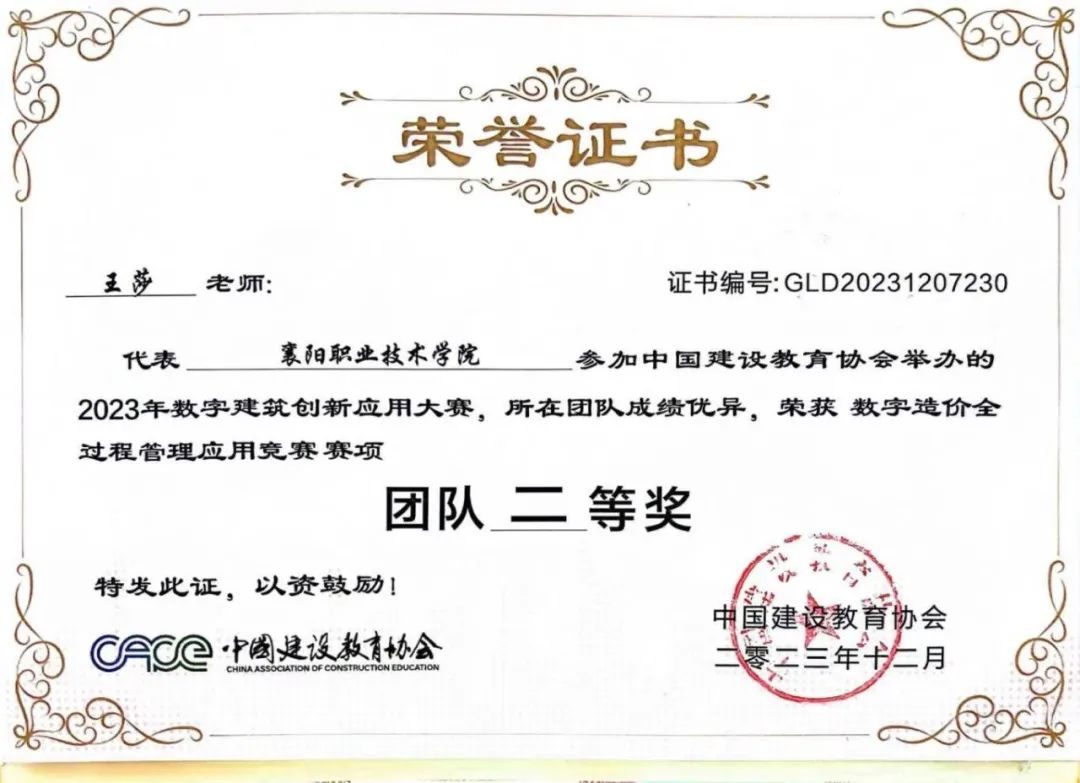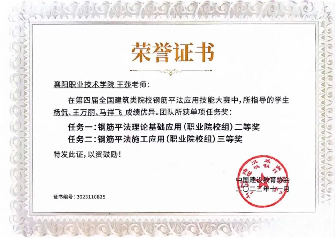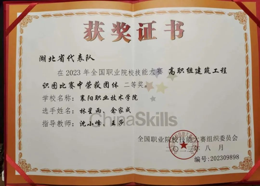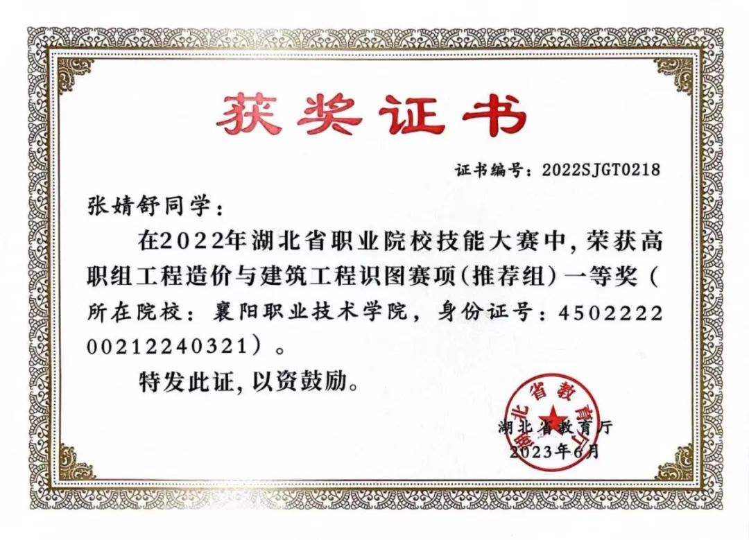2023年获湖北省职业院校工程造价与建筑工程识图学生技能大赛一等奖。