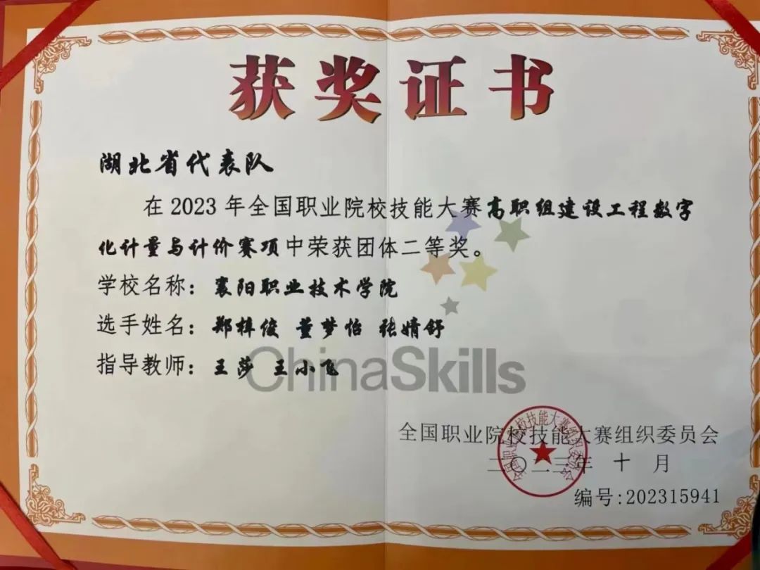 2024年获湖北省职业院校建设工程数字化计量与计价学生技能大赛一等奖。