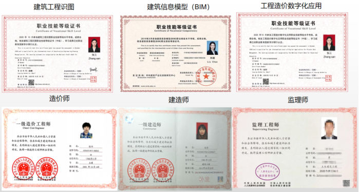 建筑工程识图、工程造价数字化应用、建筑信息模型(BIM)1+X职业技能等级证书,心理咨询师、全国大学英语应用能力考试合格证书、全国计算机等级考试证书等;毕业一年后可考取二级造价师、二级建造师等执业资格证书;毕业五年后可考取一级造价师、监理工程、一级建造师等执业资格证书。