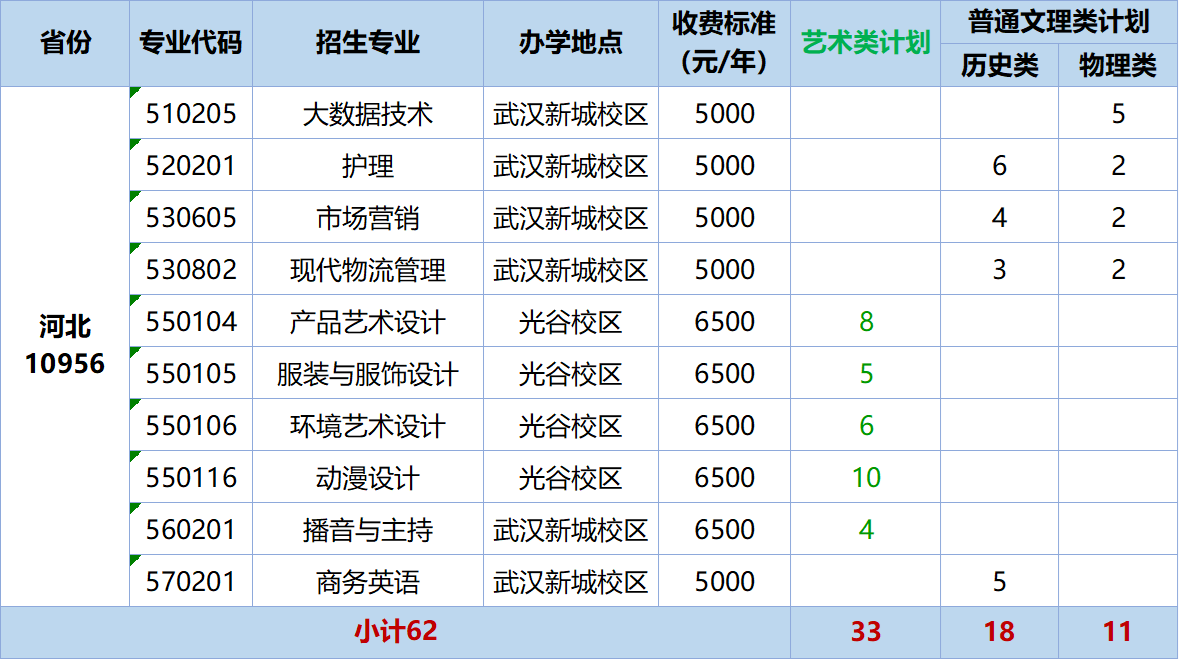 6. 招生计划:62人,其中艺术33人,历史18人,物理11人。