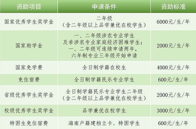 学费全免,每学期住宿费300元/人(民乐专业免缴住宿费),课本费按实际教材标准收取。