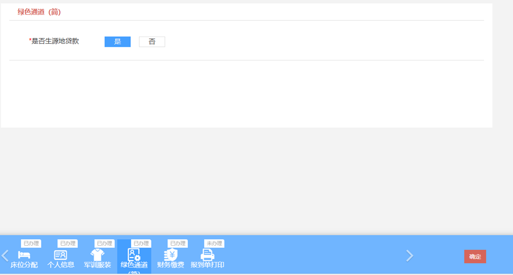 学生根据家庭情况选择是否办理生源地贷款,点击右下角“确定”完成绿色通道。