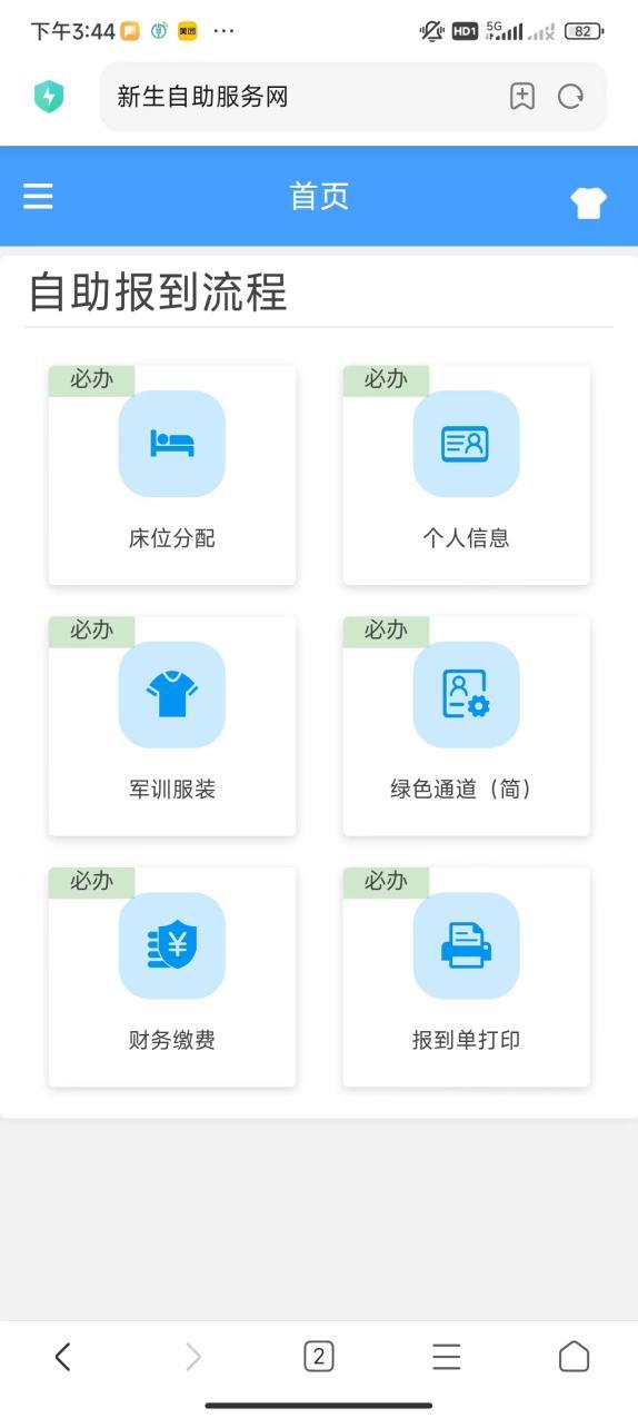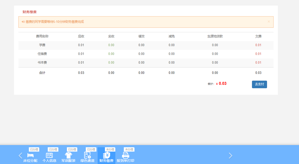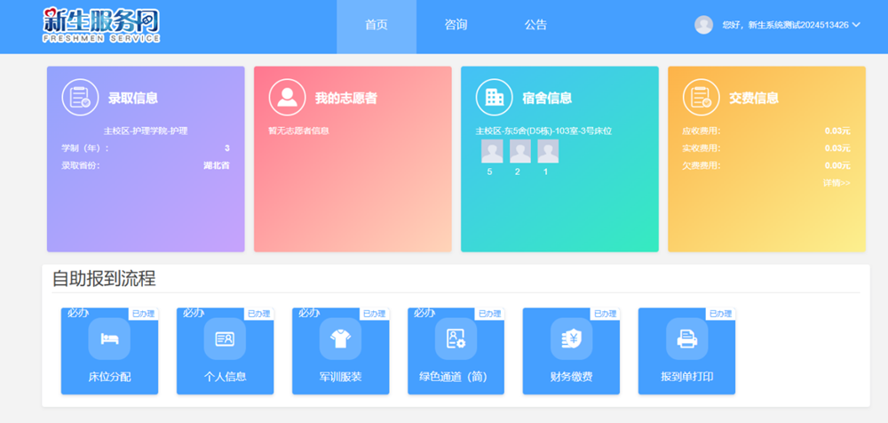 完成系统中的六个流程:床位分配、完善个人信息、军训服装、绿色通道(简)、财务缴费及报道单打印,每个流程完成后自动进入下一流程。