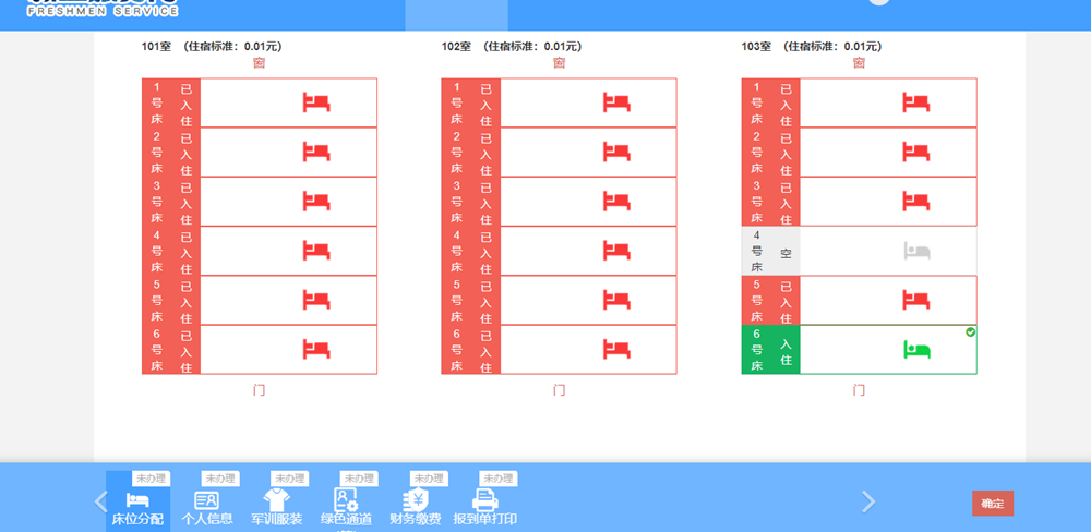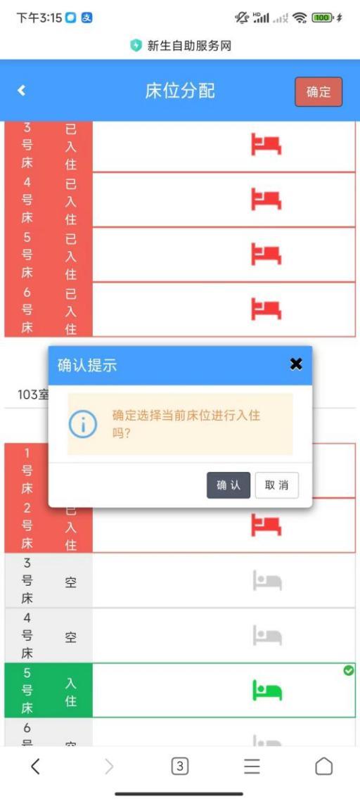 选择好床位(如103室6号床)后,点击右下方“确定”完成床位选择。