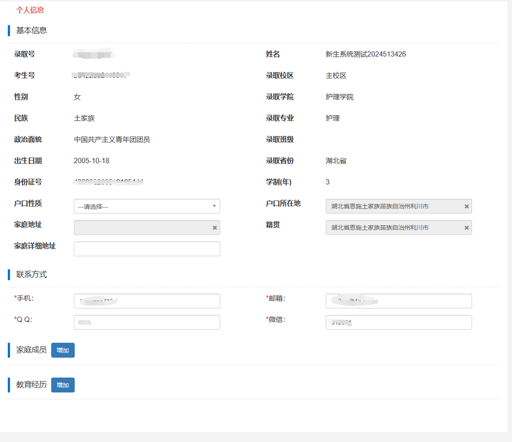 个人信息中标注*的为必填项,家庭成员、教育经历中每项最少填一条数据(点击“增加”按钮添加)。学生填写的个人信息必须准确,所有个人信息将用于学校的其他应用系统。