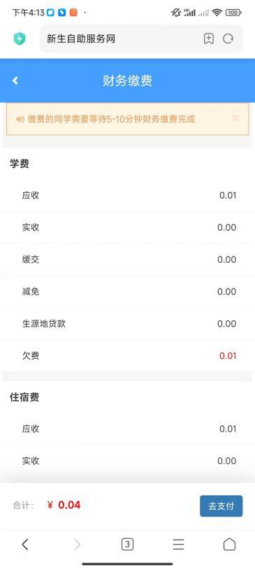 系统根据学生的就读专业、寝室床位信息自动生成应缴费用,学生确认费用清单无误后,点击右下角“去支付”跳转到财务支付界面。