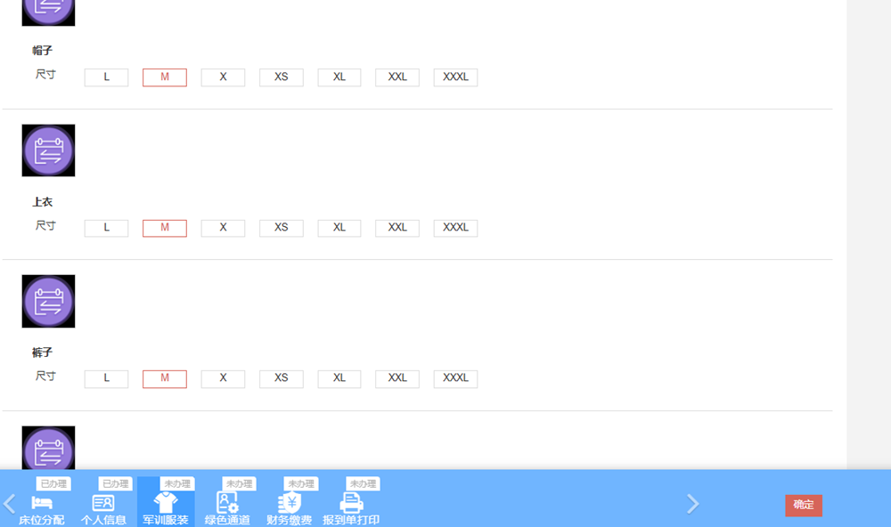 学生结合自己的身高、体重及平常衣着尺寸情况来选择军训服装,学校将根据学生所选军训服装尺寸购置和分发给学生,请各位准确选择,无误后点击“确定”按钮确认。