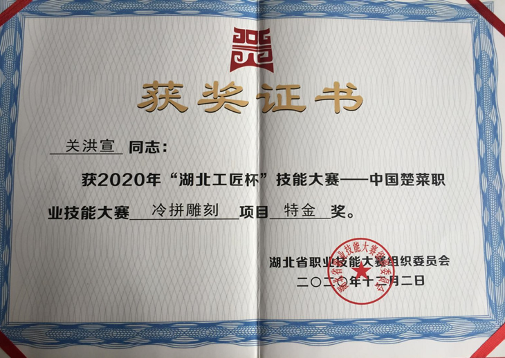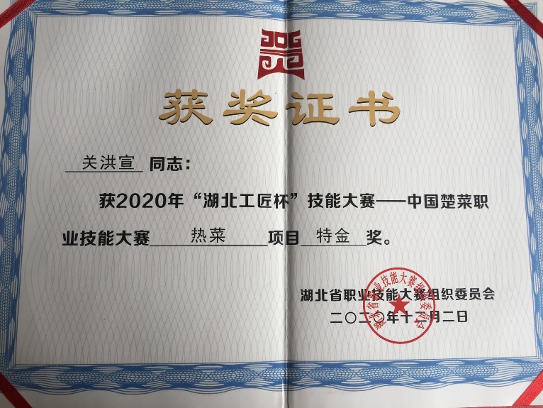 关洪宣老师荣获2020年湖北省工匠杯 楚菜烹饪技能大赛 特金奖两项