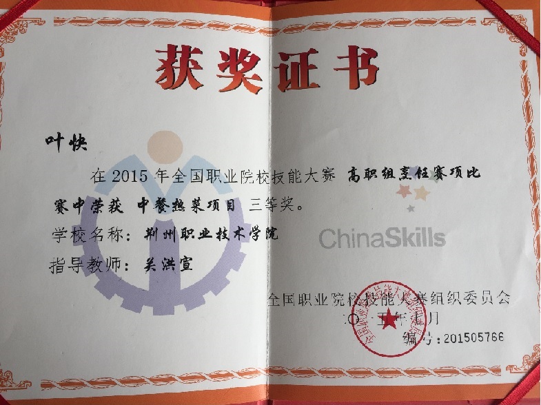 叶块同学荣获2015年全国高职院校 烹饪技能大赛三等奖