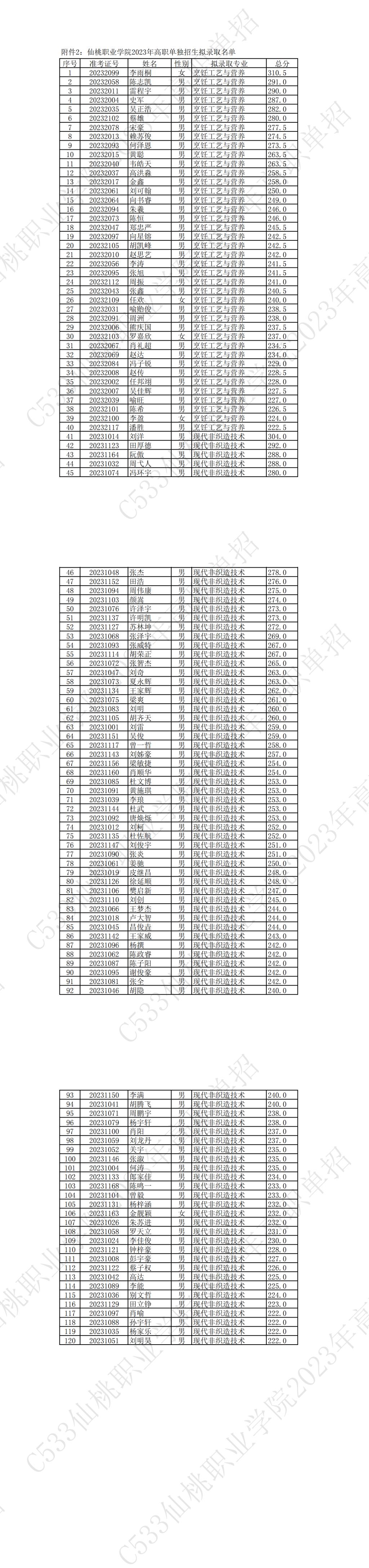 附件1:仙桃职业学院2023年高职单独招生录取分数线