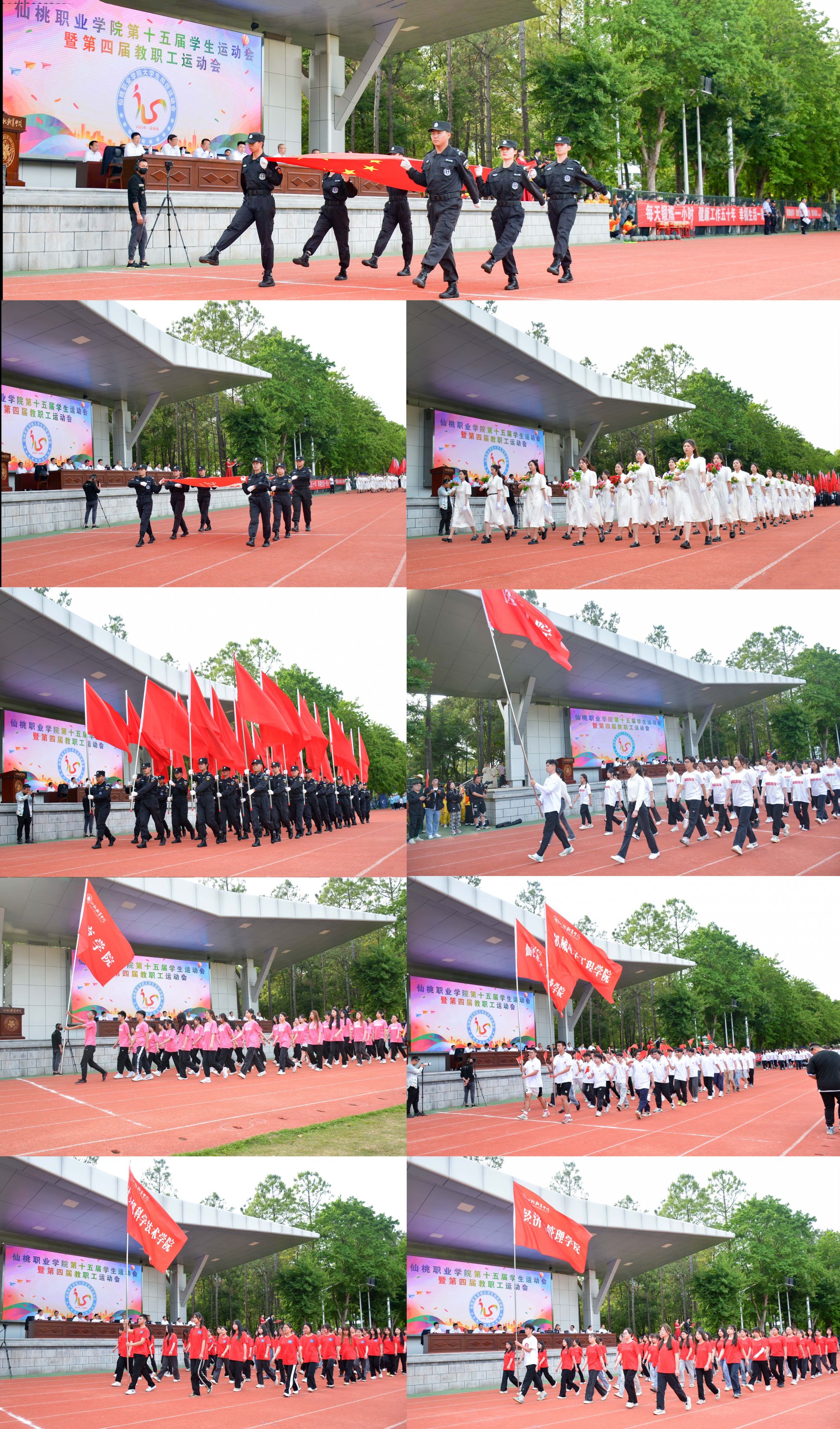 开幕式上,伴随着激昂的《运动员进行曲》,国旗方队、校旗方队、鲜花方队、裁判员方队及各代表队依次入场。各方队步伐铿锵、精神饱满,彰显着仙职师生的活力和风采。
