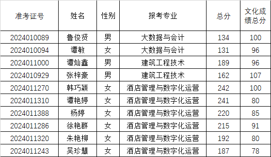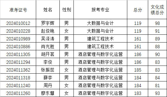 根据《省教育厅关于做好2024年高职院校单独考试招生工作的通知》(鄂教职成函〔2024〕2号)、《恩施职业技术学院2024年高职单独招生章程》及《恩施职业技术学院2024年高职单招拟录取公告》(点击查阅:http://zsxx.eszy.edu.cn/info/1003/2533.htm)公布的录取规则,“因考生自愿放弃录取资格等原因录取计划未完成时,则从线下考生中依高分到低分的顺序按意愿递补录取;同专业考生递补仍未完成递补招生计划的,则从其它专业线下考生中按照总分依高分到低分的顺序按意愿递补录取。” 鲁俊贤等10名考生自愿放弃拟录取资格,现将自愿放弃拟录取资格考生及线下同专业递补考生名单公示如下: