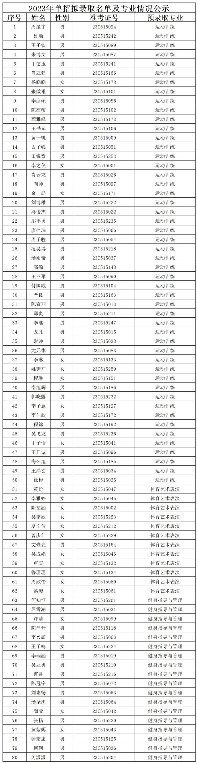 根据《湖北体育职业学院2023年高职单独考试招生录取规则及录取工作方案》有关规定,按照考生志愿、专业计划,依据综合成绩从高分到低分的原则,经学校单招工作领导小组集体讨论决定,拟录取80名单招考生,现予公示。 公示期7个自然日(2023年4月6日-2023年4月13日),公示期内如对录取结果有疑问,请及时与学校招生办公室联系,联系电话:027-87520090、027-63493095。湖北体育职业学院招生办公室 2023年4月6日