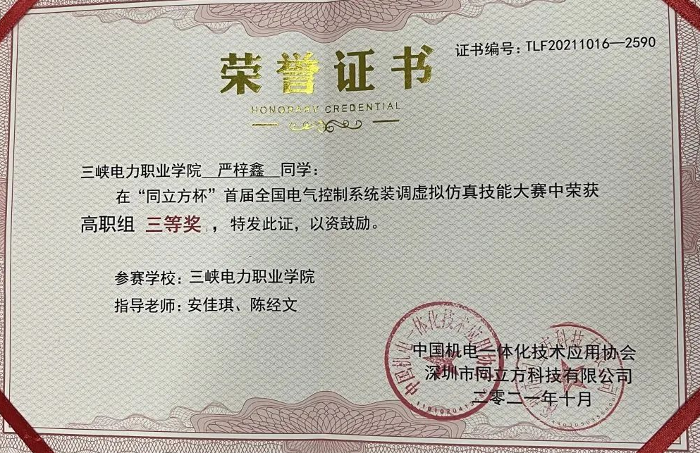 2020级电力系统自动化专业学生严梓鑫获得“同立方杯”第三届全国职业院校自动化产线装调虚拟仿真技能大赛三等奖。