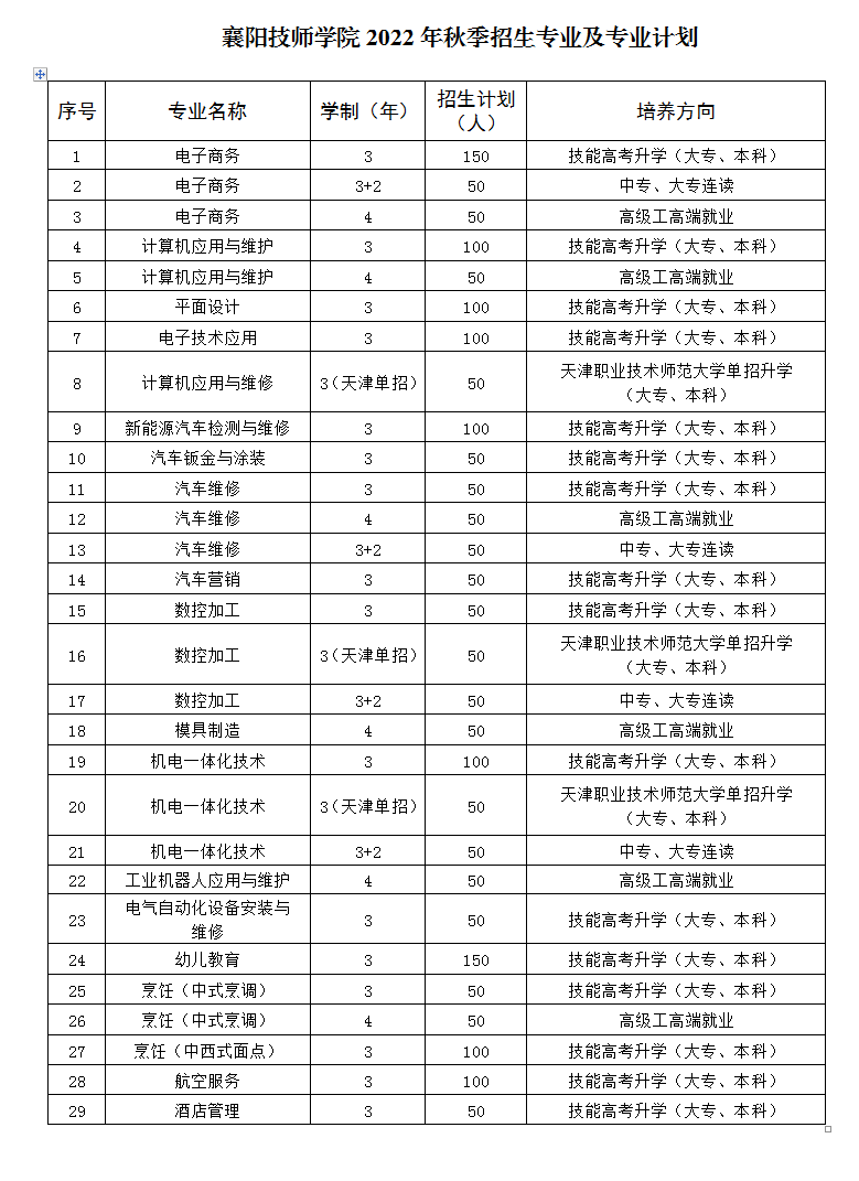 附件:《襄阳技师学院2022年秋季招生专业及专业计划》