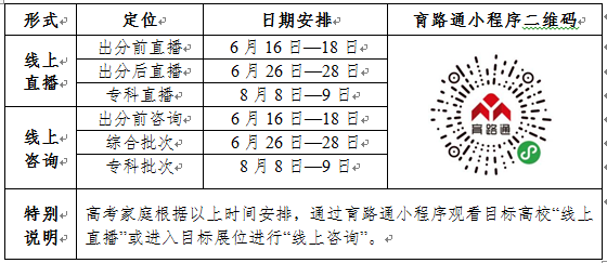 “线上咨询会”将在“育路通小程序”呈现。以云端平台链接全省高考家庭,打破时空限制,通过实时直播、动态视频、语音、文字及图片等方式,轻松获取各高校的招生政策、优势专业、办学内涵、人才培养模式等高招资讯,以云游校园的独特视角远程感受学校的学习环境和文化内涵。具体安排如下: