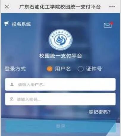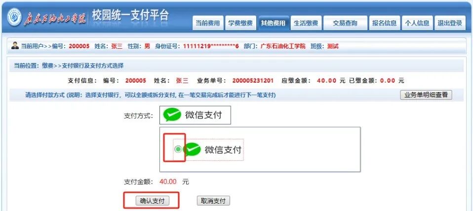 2.选择缴费方式后,使用手机微信扫码二维码后,请认真核对收款方名称,收款方为广东石油化工学院。