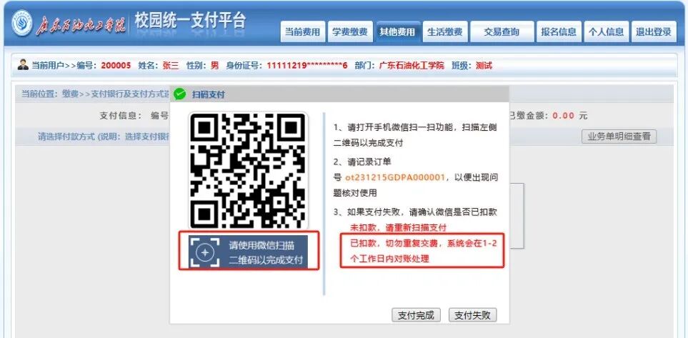 1.银行交易完成后,如缴费失败,请到网上银行查询银行卡是否已扣款,如已扣款切勿重复缴费,学校会在5个工作日恢复此次交易;