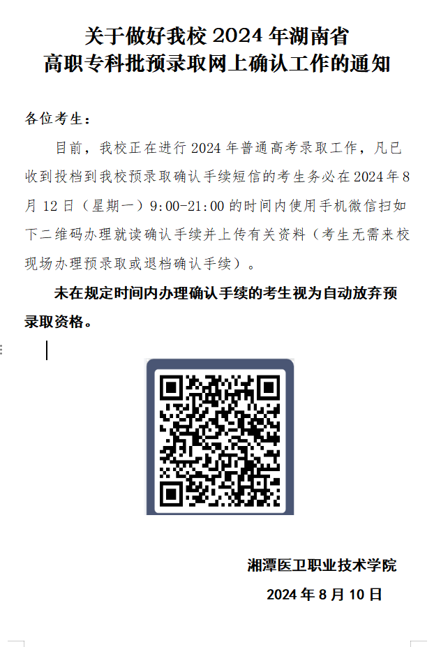 关于做好我校2024年湖南省高职专科批预录取网上确认工作的通知