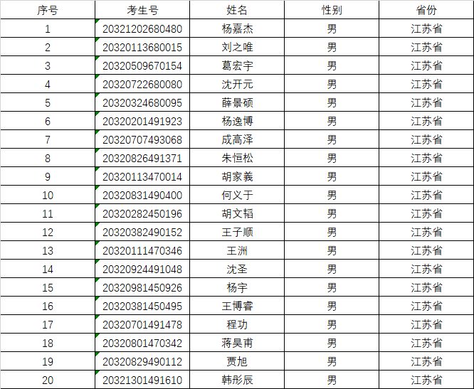 长沙航空职业技术学院2020年江苏省提前批士官录取名单