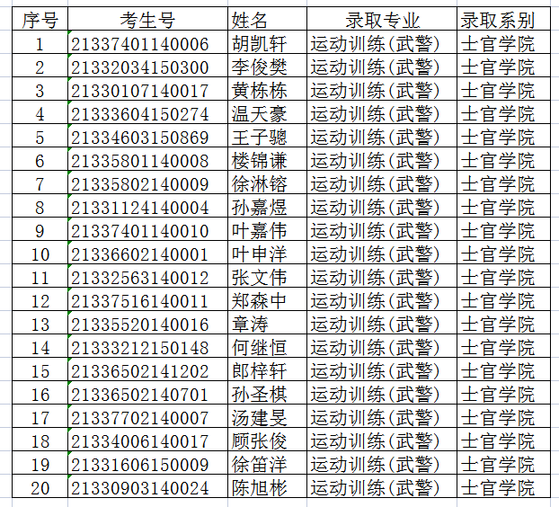 2021年我院在浙江省招收运动训练(武警定向士官)专业拟录取已完成,现将拟录取名单进行公布。