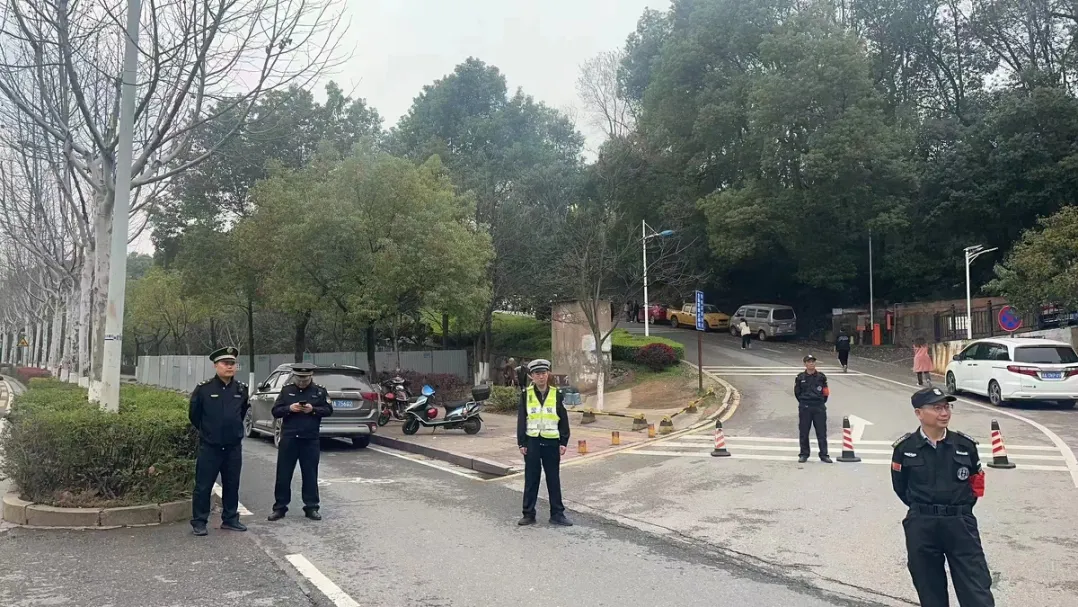 图为雨花区交警、城管以及圭塘派出所为学院单招保驾护航