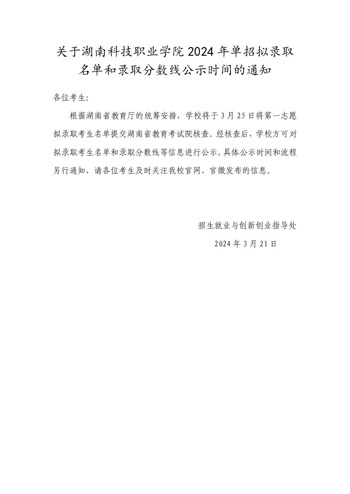 关于湖南科技职业学院2024年单招拟录取名单和录取分数线公示时间的通知