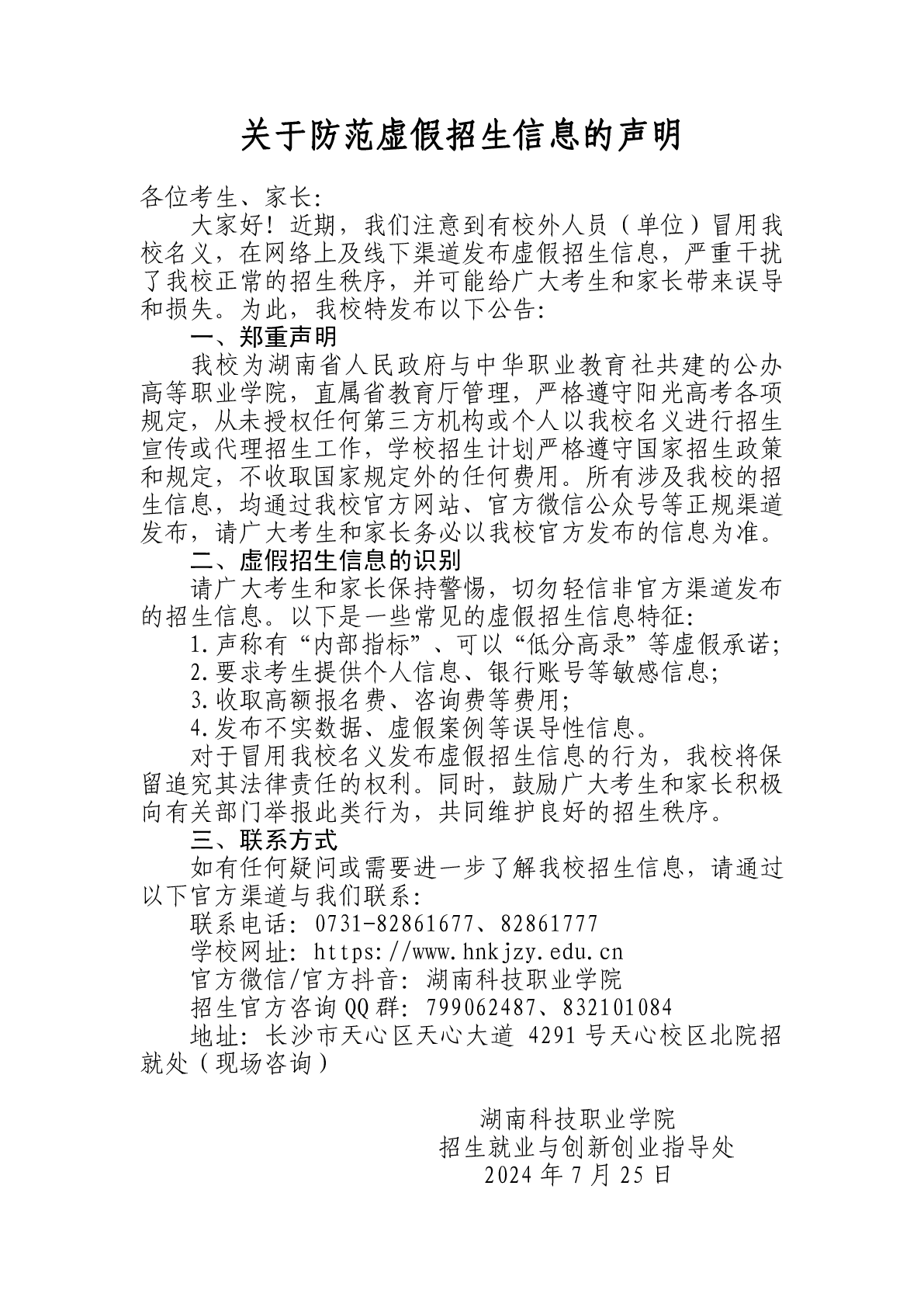 关于防范虚假招生信息的声明