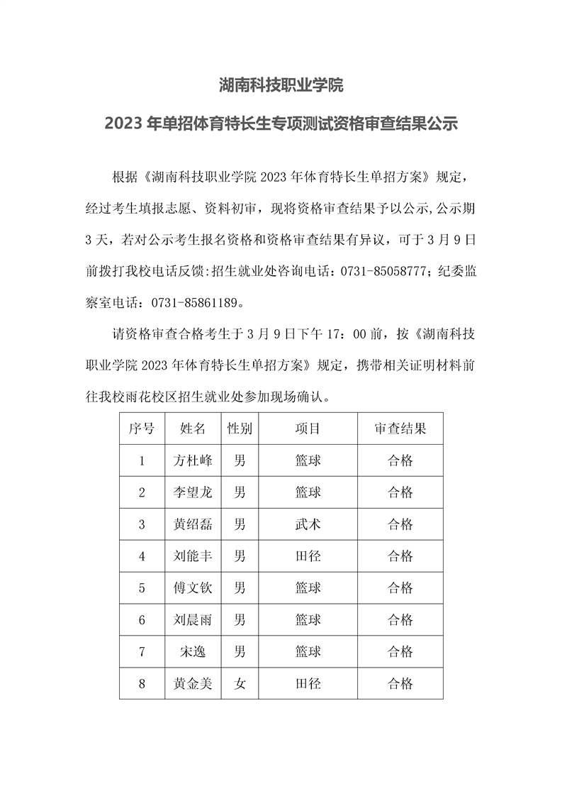 湖南科技职业学院2023年单招体育特长生专项测试资格审查结果公示