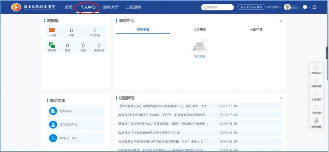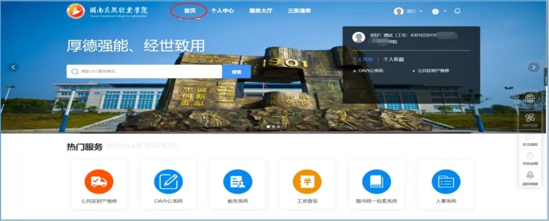 (1)从学校官网http://www.hnvc.net.cn/上沿点击“一网通办”进入(“一网通办”网址http://fw.hnvc.net.cn:29028/):