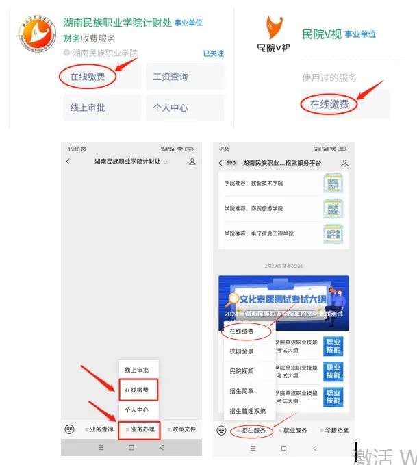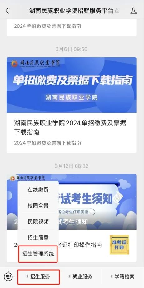 第一步:关注微信公众号“湖南民族职业学院计财处”或“湖南民族职业学院招就服务平台”或“民院V视”,点击“业务办理(或招生服务)”中的“在线缴费”;