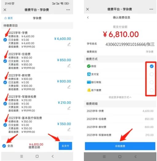 第五步:勾选需要交费的项目,点击“去支付”,选择缴费方式,点击“缴费”;