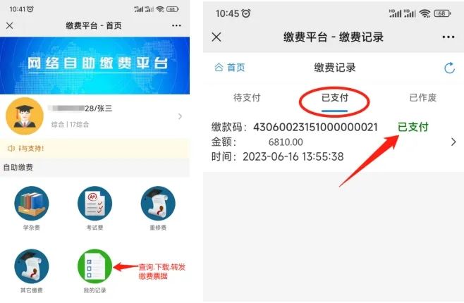 第一步:返回“自助缴费平台”首页,点击“我的记录”,点击“已支付”;