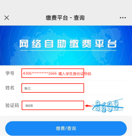 第三步:填写学生身份证号码、姓名和验证码,点击“缴费/查询”;