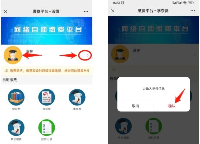 第二步:进入自助缴费平台,首次登录点击“游客”、“确认”(切换学生信息登录点击图标);