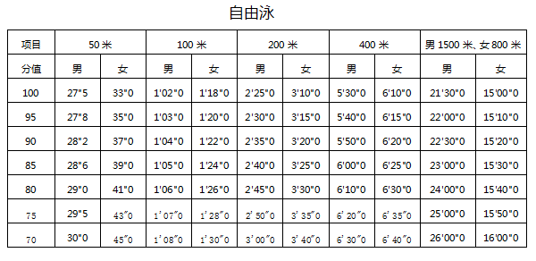 测试方法:考生可以从以下开设的游泳项目中任选一项参加考试