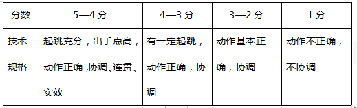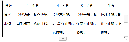 测试方法:根据考生人数和实际情况,进行全场或半场的编队比赛,测验考生的技术和战术的运用能力,比赛时间以能够全部观察、了解每个考生的情况而定。如遇人数不足情况,可采用模拟方式测试考生实战能力。评定的内容有: