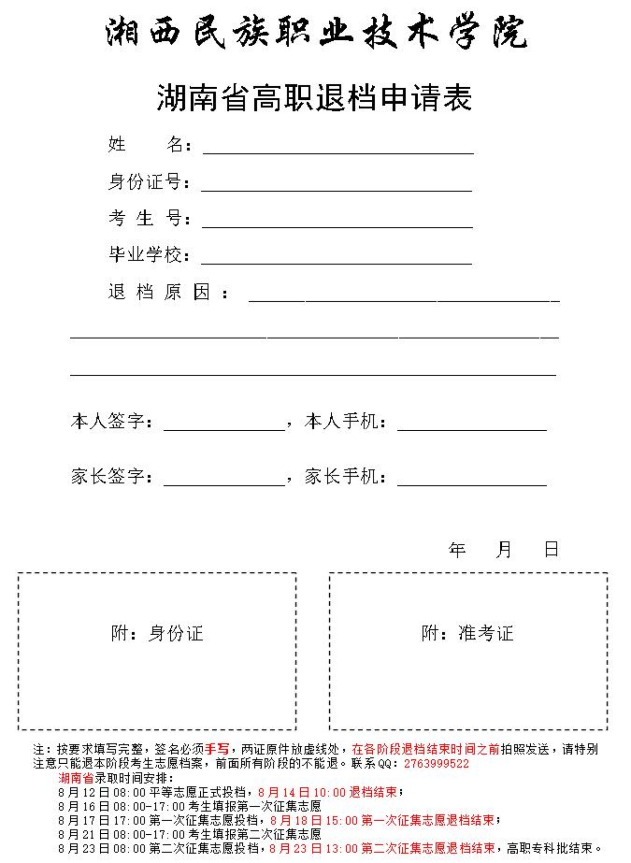 特别提醒:退档申请表及样本见附件1和附件2,按要求填写完整,签名必须手写,两证原件放虚线处,在各投档阶段退档结束时间之前拍照发送,特别注意只能退当前投档阶段考生志愿档案,前面所有投档阶段的不能退。联系QQ:2763999522(操作时间09:00~17:00)