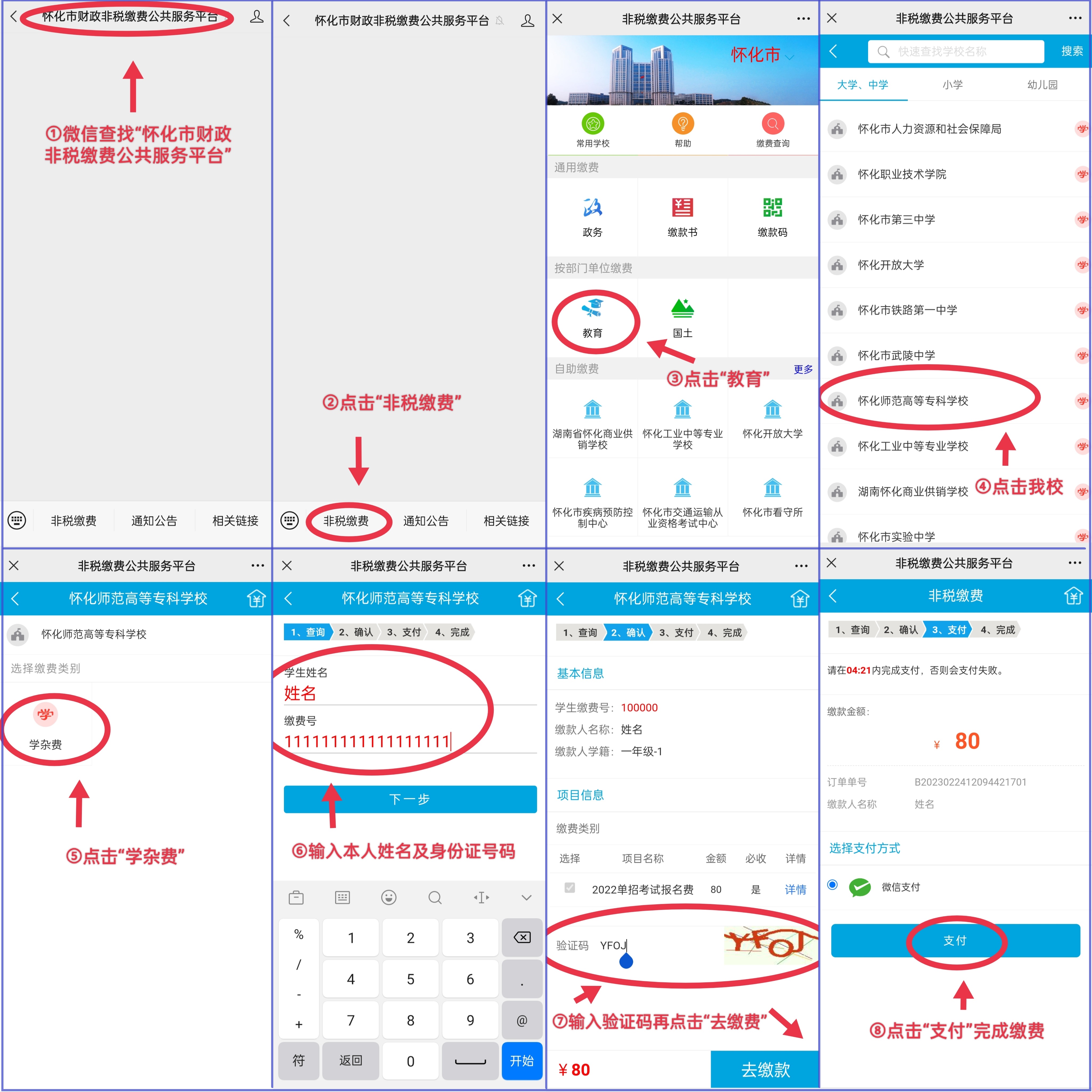 1、请考生登录我校官网,于3月4-6日17:00前按照《怀化师范高等专科学校单招考试网上缴费流程图》步骤进行缴费,不接受其他任何方式缴费。