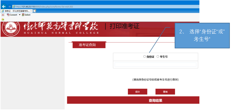 2、进入“打印准考证”界面,选择“身份证“或”考生号“。