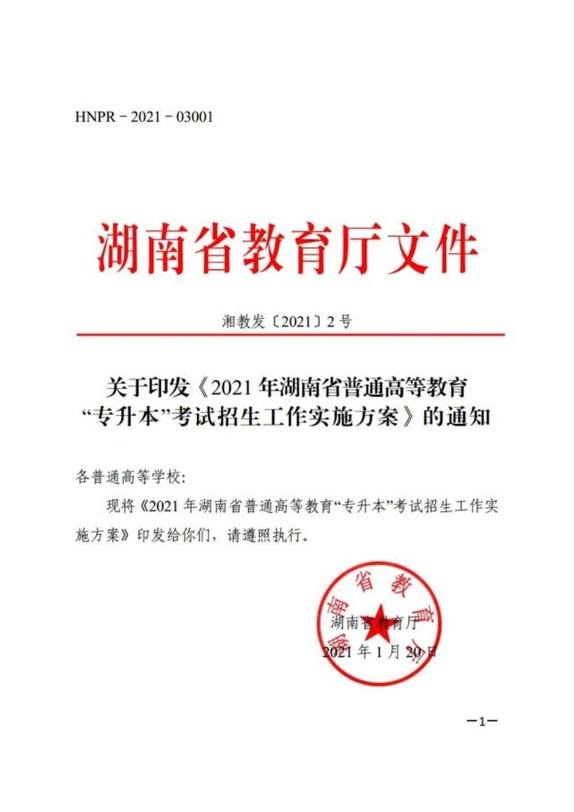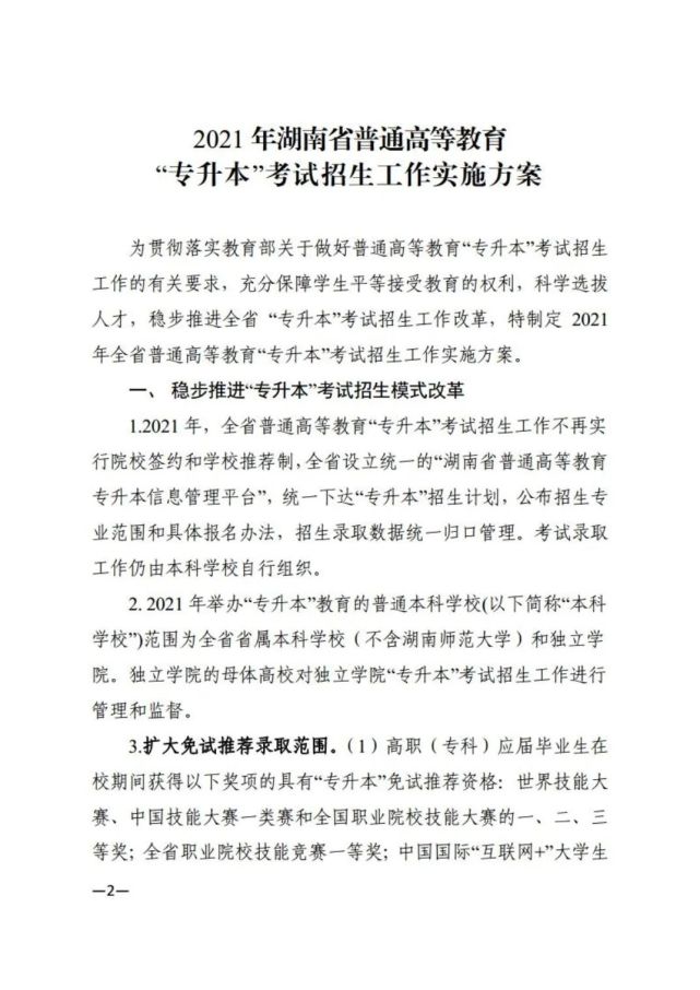 2021年1月20日湖南省教育厅下发了《2021 年湖南省普通高等教育“专升本”考试招生工作实施方案》(湘教发〔2021〕2 号)文件,针对该文件做如下解读,希望对2021届全体毕业生及家长有所帮助。