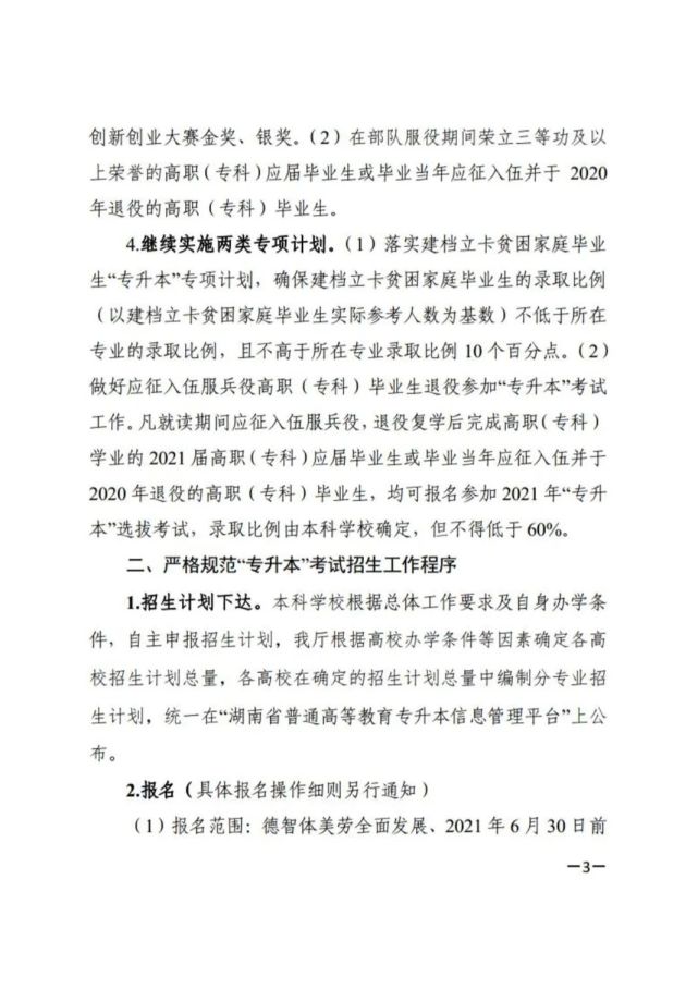 2.凡就读期间应征入伍服兵役,退役复学后完成高职(专科)学业的2021届高职(专科)应届毕业生或毕业当年应征入伍并于 2020年退役的高职(专科)毕业生,均可报名参加2021年“专升本”选拔考试,录取比例由本科学校确定,但不得低于60%。