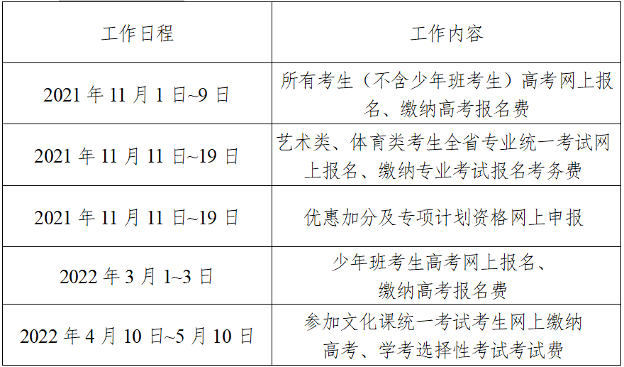 2022年我省所有高考考生都须通过网上报名,由各市(州)、县(市、区)及所属报名点通过网上报名系统采集考生报名信息。1.时间安排