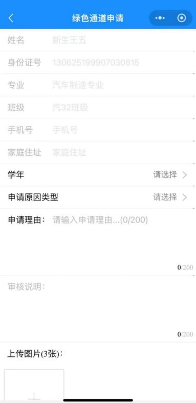4.如有(建档立卡,助学贷款,家庭困难,参军入伍,等其他因素)以上条件需求的同学在迎新首页点击“绿色通道”进入绿色通道申请界面填写个人信息申请提交。