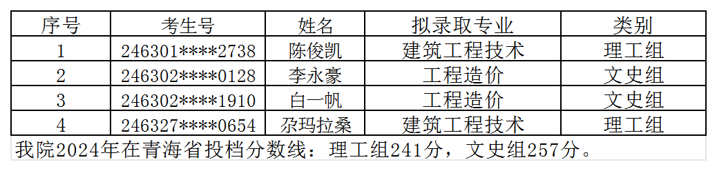 湖南城建职业技术学院2024年普招拟录取名单公布(青海省)