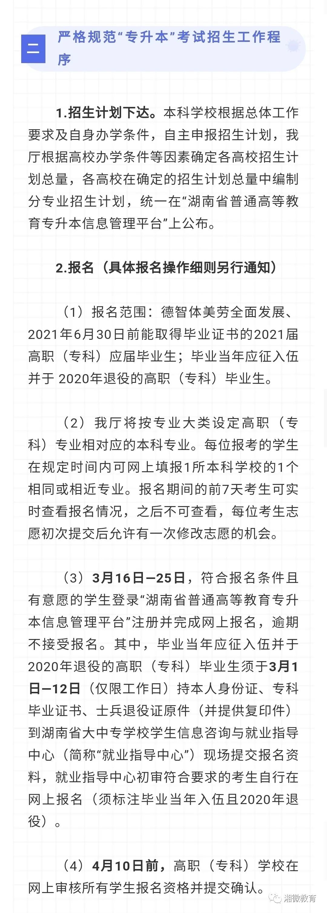 1月20日,湖南省教育厅印发了《2021年湖南省普通高等教育“专升本”考试招生工作实施方案》。《方案》指出,2021年,全省普通高等教育“专升本”考试招生工作不再实行院校签约和学校推荐制,全省设立统一的“湖南省普通高等教育专升本信息管理平台”,统一下达“专升本”招生计划,公布招生专业范围和具体报名办法,扩大免试推荐录取范围,继续实施两类专项计划。具体如何实施?一起来看。